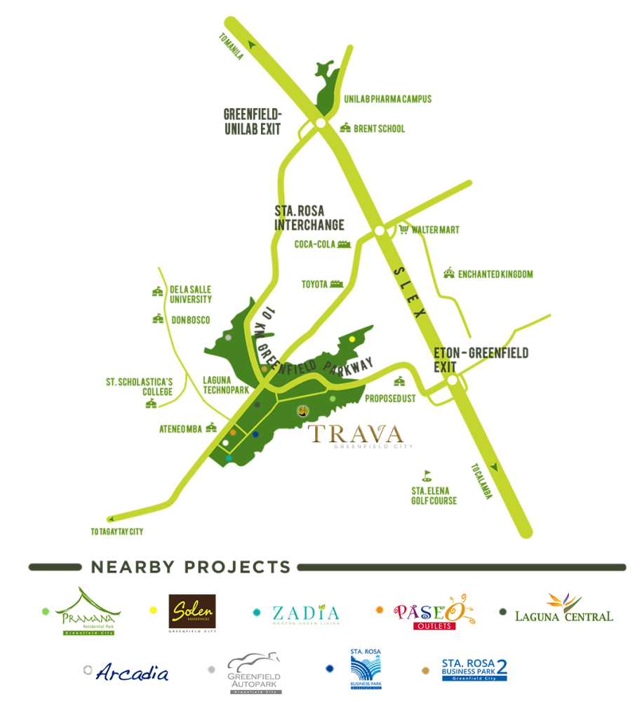 Trava is located at Brgy. Don Jose, Greenfield Parkway, Sta. Rosa, Laguna, Philippines.